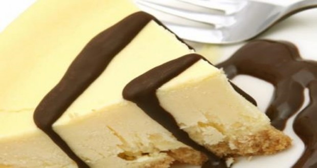 – توضع شوكولاته الطهي المذوبة والمبردة على تشيز كيك بشكل لولبي، يبرد حتى يجمد